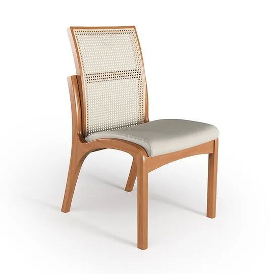 Estrutura em madeira maciça, encosto em tela natural e assento estofado.